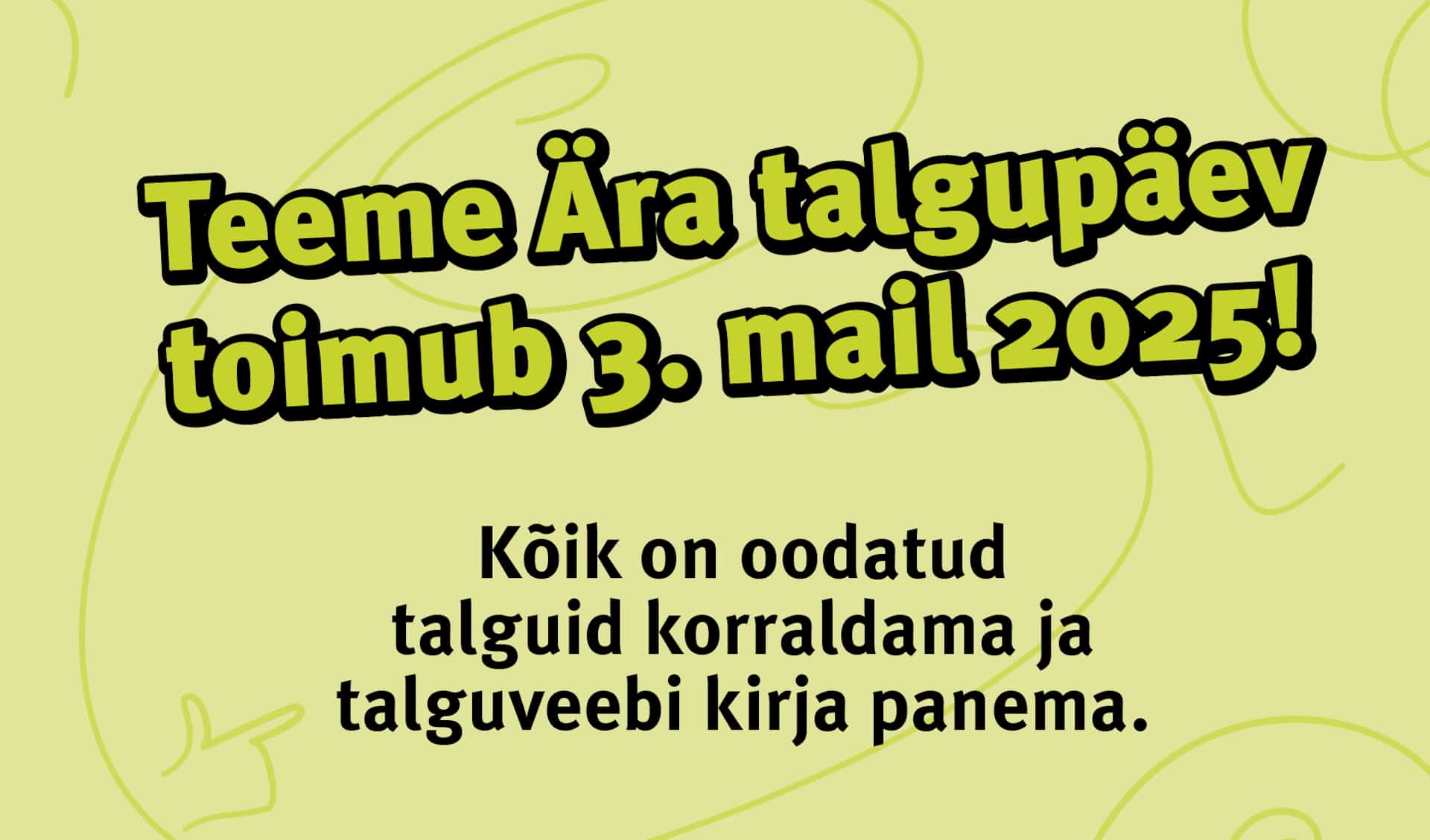 Laupäeval, 3. mail toimub traditsiooniliselt üle-eestiline Teeme Ära talgupäev. Tänavune talgukevad võtab fookusse kogukondade kriisivalmiduse, raamatujagamise, kappide meisterdamise ja Eestile ...
